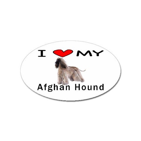 The I Love My Afghan Hound Dog oval magnet is a great gift for yourself or someone who owns an Afghan Hound. The oval magnet is weather and wind proof, so you can put on your car, truck or any type of transportation. The oval magnet does not just have to be put on cars, they will stick to anything magnetic like a refrigerator or file cabinet. What better way to show how much you love your Afghan Hound, than to have it on your car while you are driving to work or anywhere! The magnet measures at 5 inches x 3 inches and is an oval shape.
