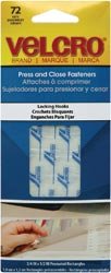 VELCRO-Press And Close Hook Fasteners. These mini self-adhesive fasteners are perfect for a vast variety of applications. For use indoors only; these 5/8x1/2in; clear hook & loop fasteners will grab on to plastic; glass; metal; paper and much more. NOTE: do not use on fabrics; flexible vinyl or any place where fastener will be exposed to extreme heat or direct sunlight. This package contains seventy-two fasteners. Made in USA.