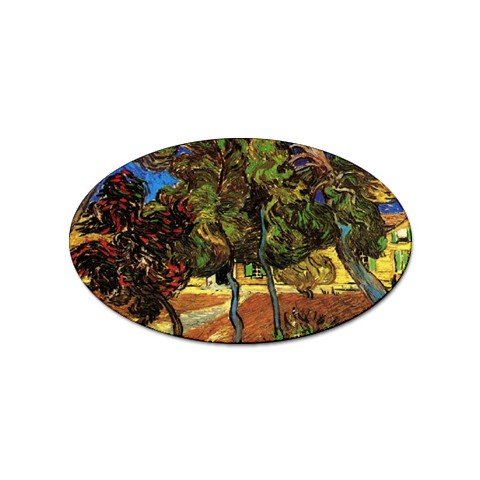 Trees in the Garden of Saint-Paul Hospital by Vincent Van Gogh on an oval magnet! This magnet measures approximately 5 inches by 3 inches. This large size magnet featuring the Van Gogh Painting Trees in the Garden of Saint-Paul Hospital is weather and wind proof. The beautiful colors in the Trees in the Garden of Saint-Paul Hospital painting will not fade or discolor and is certain to stick to anything magnetic!